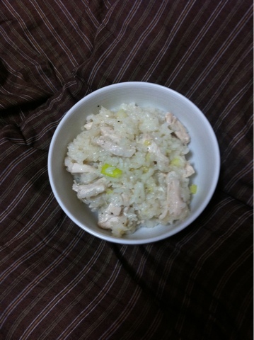 For 2 portions, you’ll need 1.5 cups cooked rice (Japanese type would be best because of it’s gumminess), chicken stock, pepper, shallots (I used 1/3 ??), and fresh ginger. The last item may be tricky: ?? (konbu). This kelp is often used in Japanese cuisine to infuse cooking liquid. As a cheat, you could try it with ?? (dry sea weed used in sushi rolls) – an accomplished cook may freak out at this suggestion, but as we say in South Africa, “‘n boer maak ‘n plan.”
