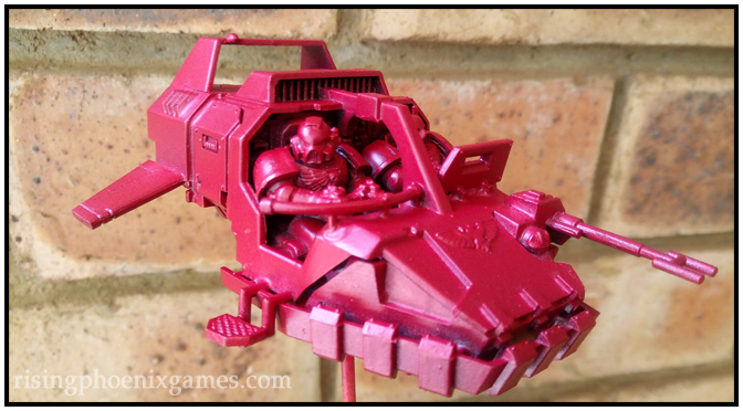 This guy will be sporting Angels Encarmine colours, which I interpret as a darker take on the Blood Angels paint scheme. For this project, I wanted to try a zenithal undercoat, so I hit it with black on the bottom and white on the top. It seems to have blended well enough in the middle, but some people hit it with a grey coat in the centre of the vehicle for a more gradual blend.