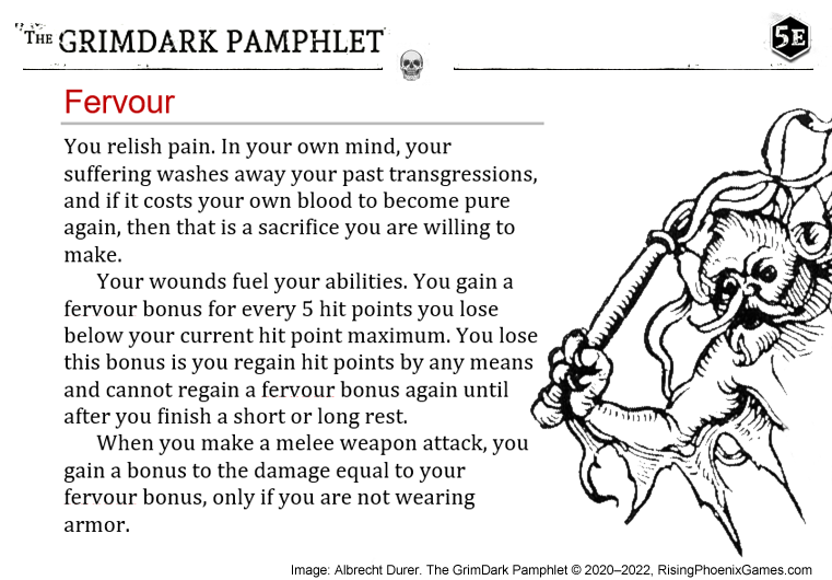 Our design goals for The Grimdark Pamphlet were straightforward: provide quality, playable, yet simple rules for playing darker stories with the fifth edition ruleset.